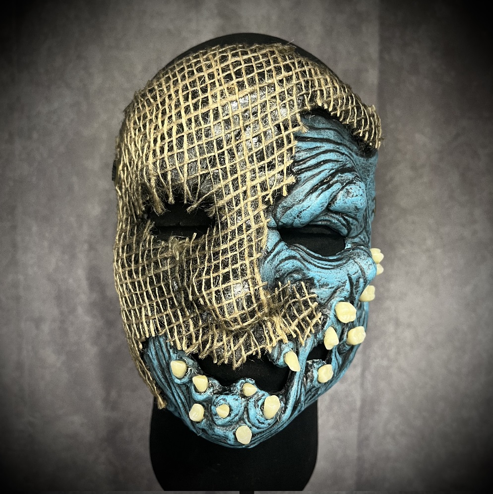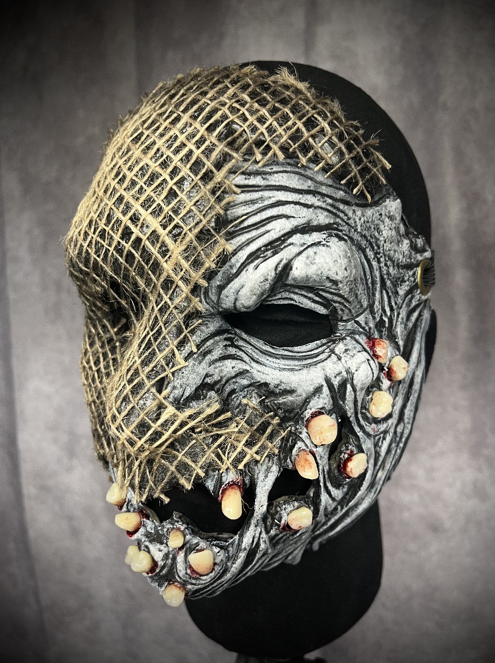 Hand made latex half mask with acrylic teeth, burlap over mask, with 1/2 nylon strap through metal eyelets. prototype Jeffrey Nothing mask from 2011-2012 era