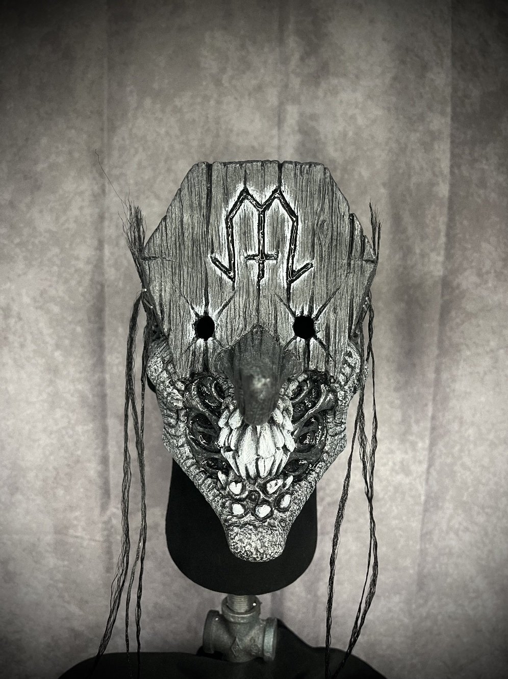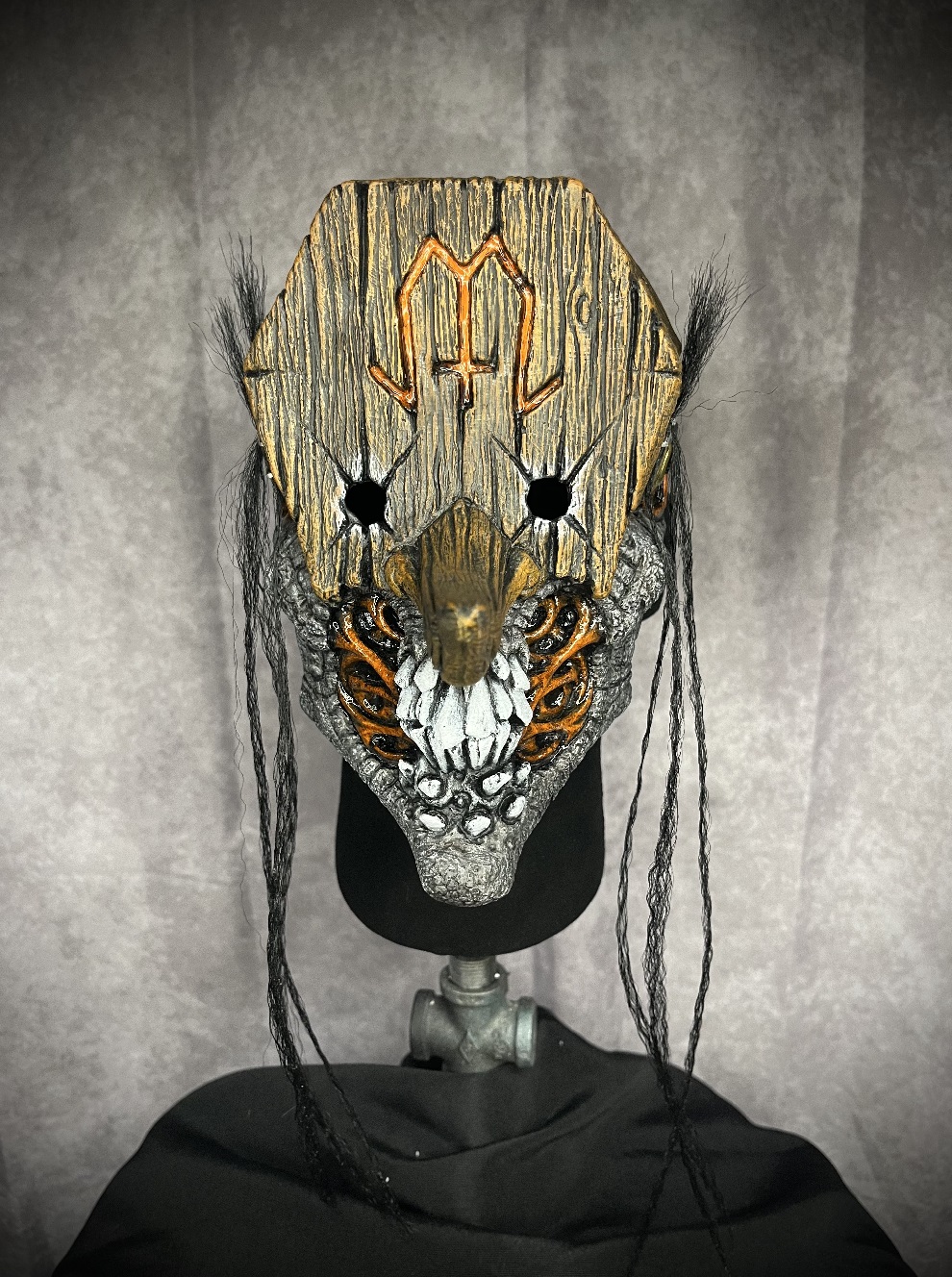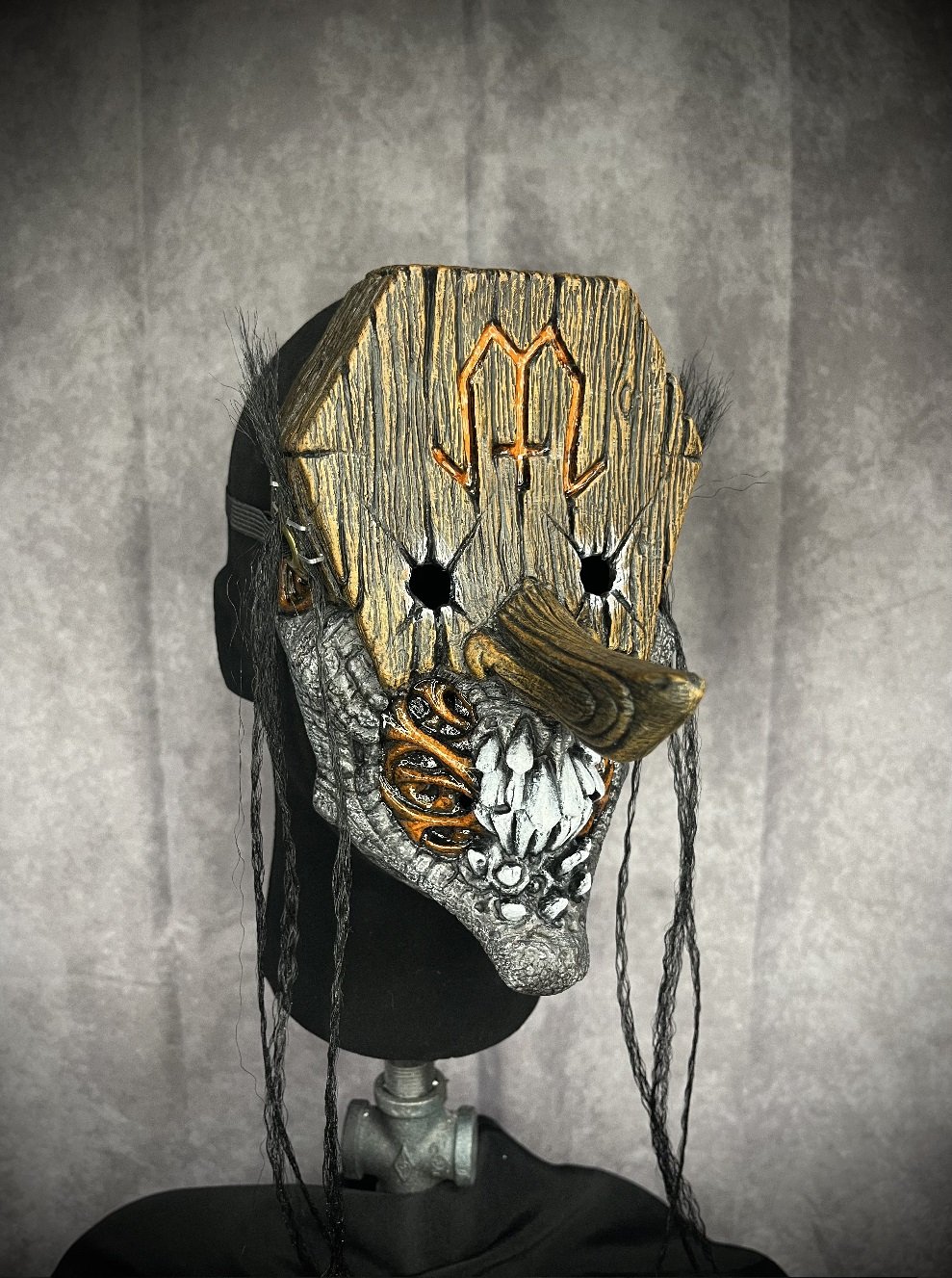 The Autumn Fool, the undead jester of the Autumn Equinox. Hand made latex half mask with stapled hair, high gloss areas, and a 1/2 in nylon strap through metal eyelets.